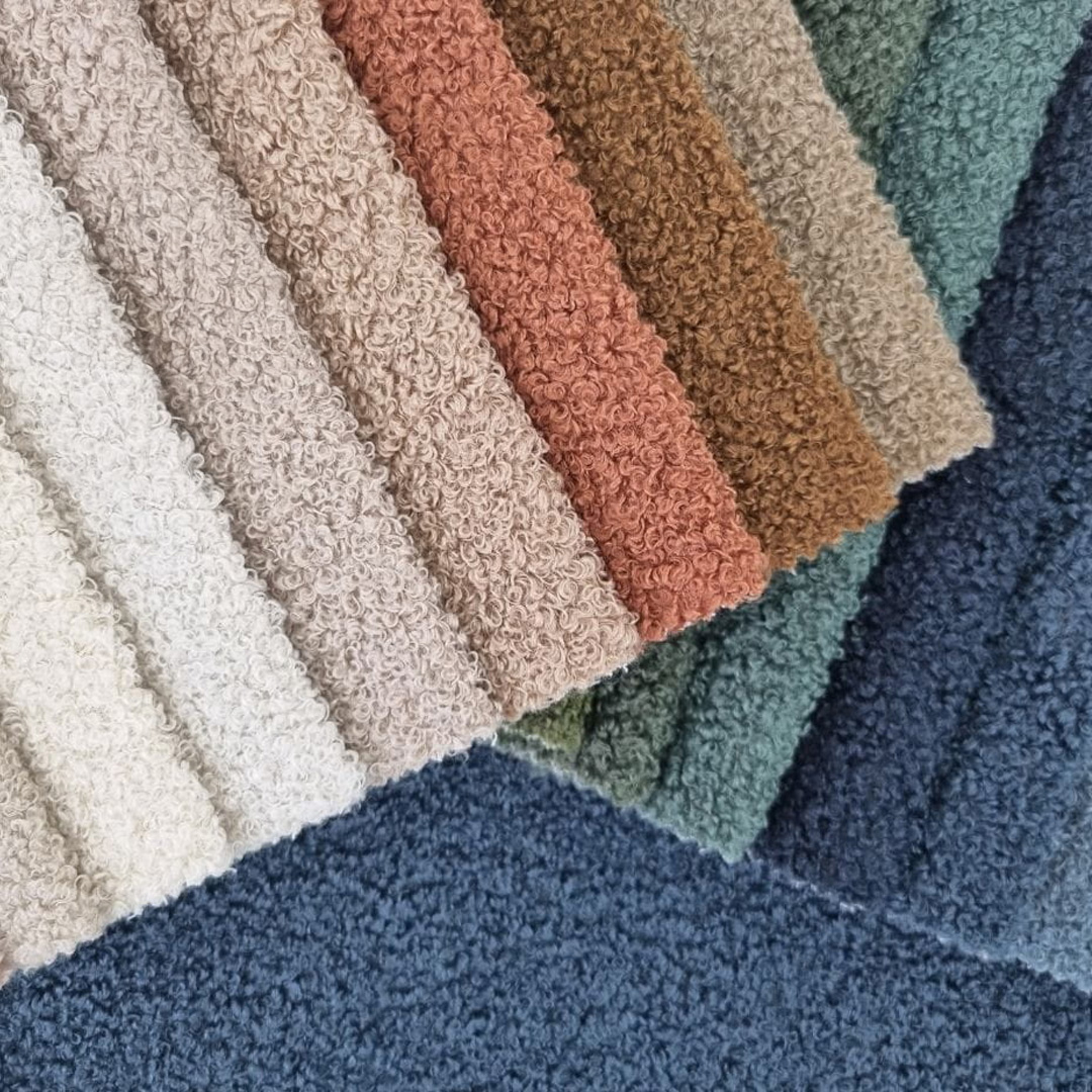 Fabric made from recycled polyester, featuring loops and knots in varying sizes and a subtle sheen that gives furniture a distinctive character. Clean the surface using only gentle upholstery-specific cleaning products.