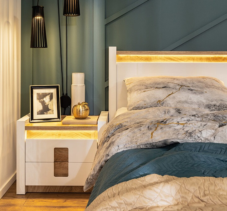 This furniture collection is unique in that it offers a wide selection of furniture models for various home spaces. Create a solid interior in both the living room and the bedroom. What if the furniture fits in the hallway as well? Or in the office? All of this is possible with this collection. The light color palette will look great in both small and large spaces. The facades of the furniture are dominated by glossy white color, which is perfectly complemented by wood-colored details. The color and patterns of the wood are beautifully revealed in the furniture tables, giving a feeling of coziness. The handle solution also catches the eye, which fits in not only as handles, but also as a decor detail. There will certainly be enough space for storing things, the furniture has plenty of drawers and shelves. Additional charm is provided by integrated energy-saving LED lighting. This solution will allow you to enjoy a cozy light that will highlight the wood-colored inserts. The silent closing mechanism will protect the doors and drawers from closing quickly.