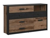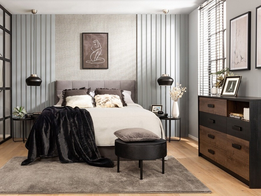 Industrial style lovers must see this collection. In the facades of the collection dominates dark colors of 'Monastery' and black oak. The dark oak color is perfectly complemented by the black border, which gives uniqueness to the furniture design. Quite massive black handles were chosen, which fit perfectly into the whole. The color and patterns of the wood create a unique looking industrial furniture design. The collection uses tempered glass, which is safer and has greater mechanical resistance than ordinary glass. For the interior of the bedroom, you can choose beds of several different sizes with or without a bedding box. The bed set includes a lattice with a gas lifting mechanism. You can add additional charm to the collection by additionally ordering energy-saving LED lighting. The furniture of the collection has both open and closed storage areas, so it is suitable for practical display of personal belongings.