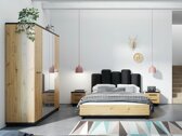 This furniture collection offers furniture for the living room and bedroom. Modern design and elegant lines complement each other creating a perfect combination. The collection catches the eye with its warm colors and wood patterns. Matt's black panels is matching with oak facades. This combination of colors complements each other, emphasizing the shape of the furniture. Tempered glass is used in the showcases, which is more resistant than ordinary glass. A bed with an exclusive design will become the highlight of the bedroom. Soft headboard, bed linen box, gas lifting mechanism, everything you need for your perfect rest. The edges of the furniture in this collection are protected with finishing tape, which is usually used to protect the edges of the panels.