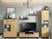 This furniture collection offers furniture for the living room and bedroom. Modern design and elegant lines complement each other creating a perfect combination. The collection catches the eye with its warm colors and wood patterns. Matt's black panels is matching with oak facades. This combination of colors complements each other, emphasizing the shape of the furniture. Tempered glass is used in the showcases, which is more resistant than ordinary glass. A bed with an exclusive design will become the highlight of the bedroom. Soft headboard, bed linen box, gas lifting mechanism, everything you need for your perfect rest. The edges of the furniture in this collection are protected with finishing tape, which is usually used to protect the edges of the panels.