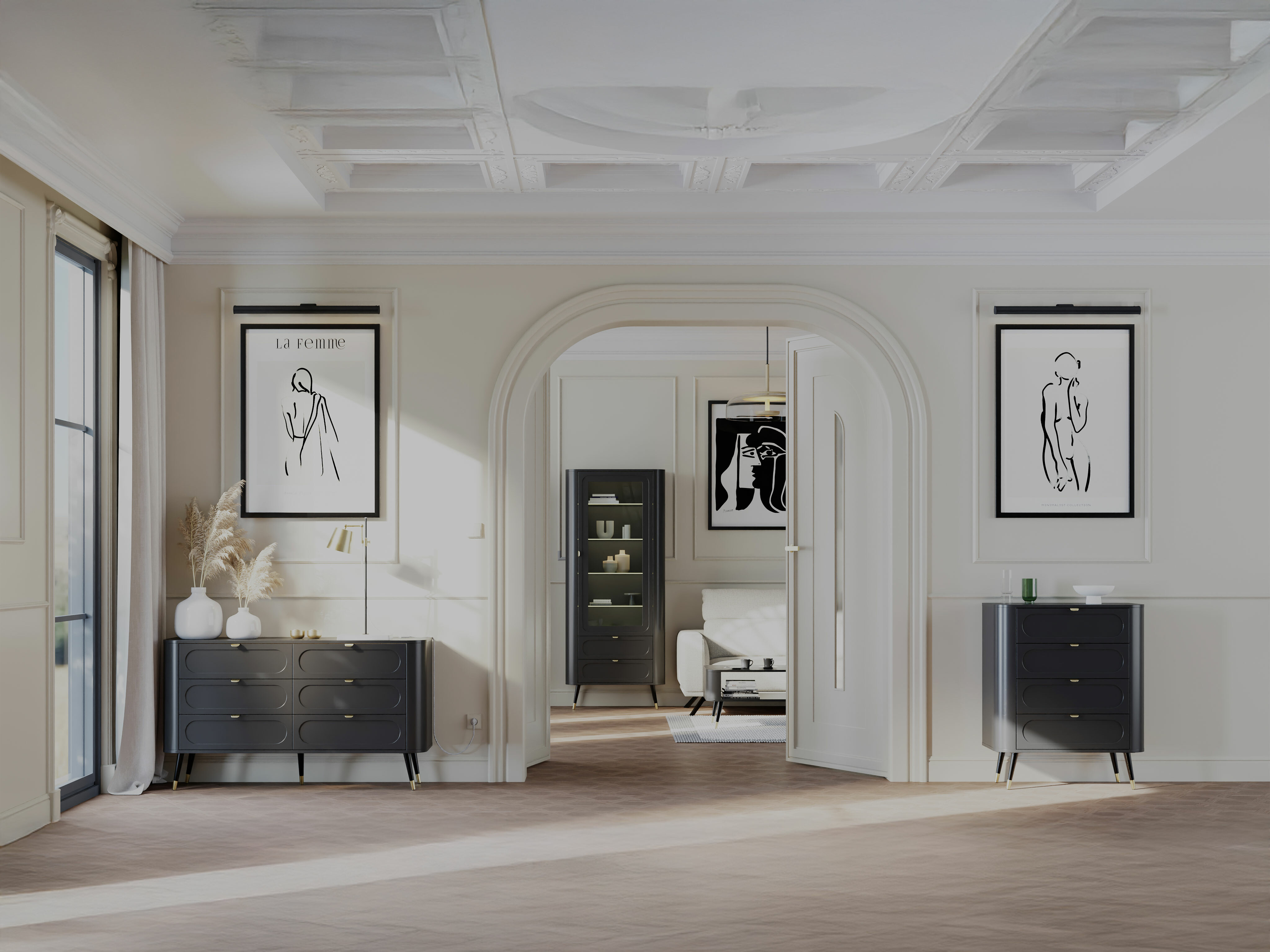 This modern classic furniture collection is an excellent choice for those seeking refined elegance and understated luxury in their home. A distinctive feature of the collection is its gently rounded corners, which lend the furniture a sense of softness and harmony. Fluted fronts, combined with minimalist gold toned handles, highlight the character of modern classic design and add a stylish accent to each piece. The elegant design allows the furniture to blend harmoniously into various living spaces, maintaining both aesthetic coherence and everyday functionality.
