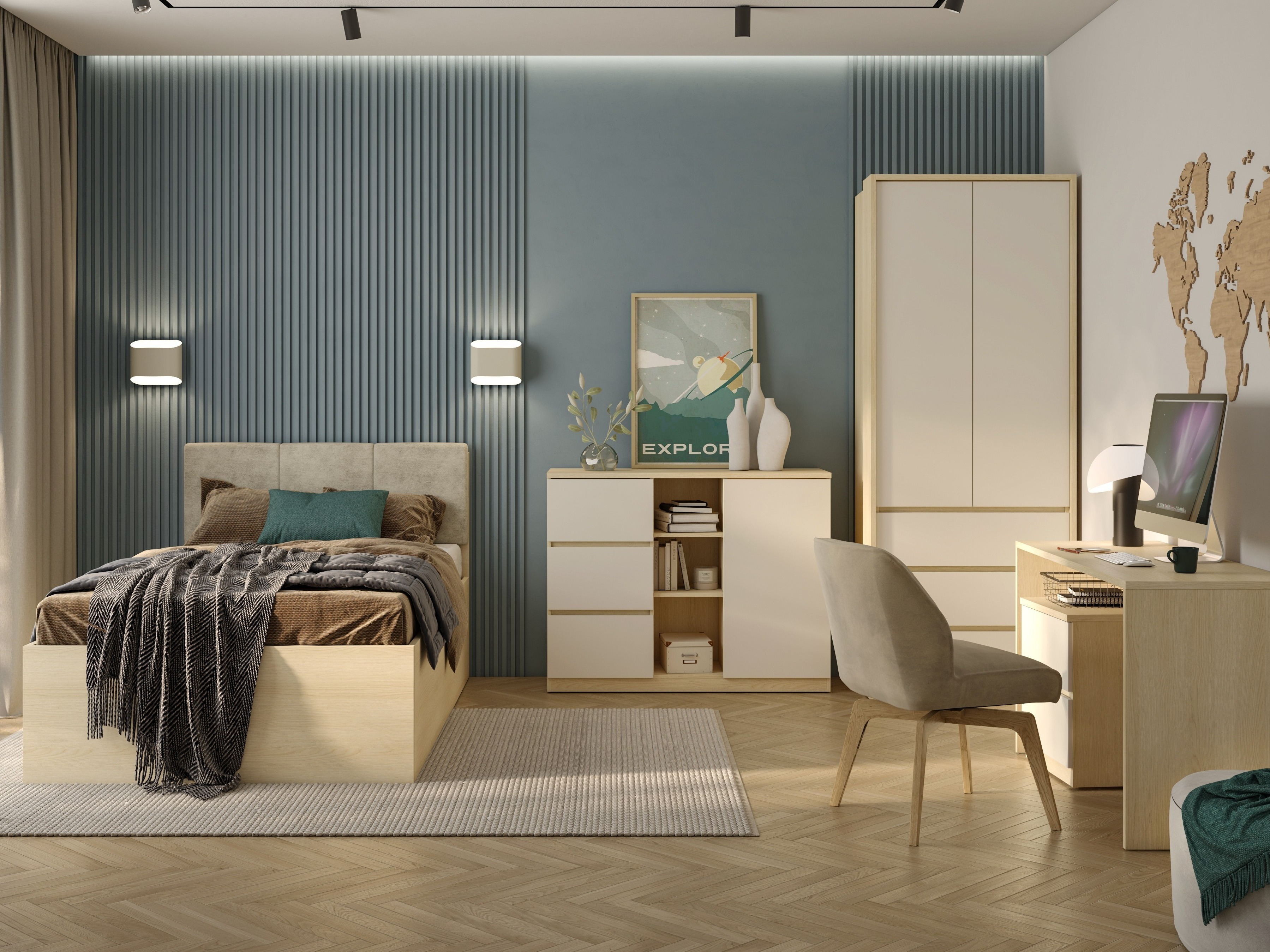 The calming cream and eucalyptus tones of the range combine contemporary design with the warmth of light oak. Functionality is at the core of this collection, offering everything needed for a comfortable work or relaxation area. Soft-close mechanisms ensure a quiet and undisturbed home environment. These pieces do not overwhelm a space; instead, they add light, order, and Scandinavian minimalism.