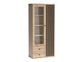The 'Artisan' oak color dominates the collection and hints of wood patterns can be seen on the facades. Small black metal handles blend perfectly into the whole design. Decorative vertical lines become an accent of the collection. This solution gives the furniture an exclusive character and also replaces the furniture handles, allowing the furniture doors to be opened. Furniture does not lack shelves and drawers, which will help to store the most important things. A silent closing mechanism is installed into the furniture, which is special because it protects doors and drawers from quick closing. Thanks to special dampers, the doors and drawers are stopped just before closing and slowly retracted without causing any noise. From a cabinet to a showcase, from a TV table to a hanging shelf, in this collection, you will find a variety of furniture for the living room. If you want to create a complete interior without much effort, choose a furniture set.