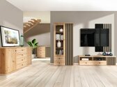 The 'Artisan' oak color dominates the collection and hints of wood patterns can be seen on the facades. Small black metal handles blend perfectly into the whole design. Decorative vertical lines become an accent of the collection. This solution gives the furniture an exclusive character and also replaces the furniture handles, allowing the furniture doors to be opened. Furniture does not lack shelves and drawers, which will help to store the most important things. A silent closing mechanism is installed into the furniture, which is special because it protects doors and drawers from quick closing. Thanks to special dampers, the doors and drawers are stopped just before closing and slowly retracted without causing any noise. From a cabinet to a showcase, from a TV table to a hanging shelf, in this collection, you will find a variety of furniture for the living room. If you want to create a complete interior without much effort, choose a furniture set.