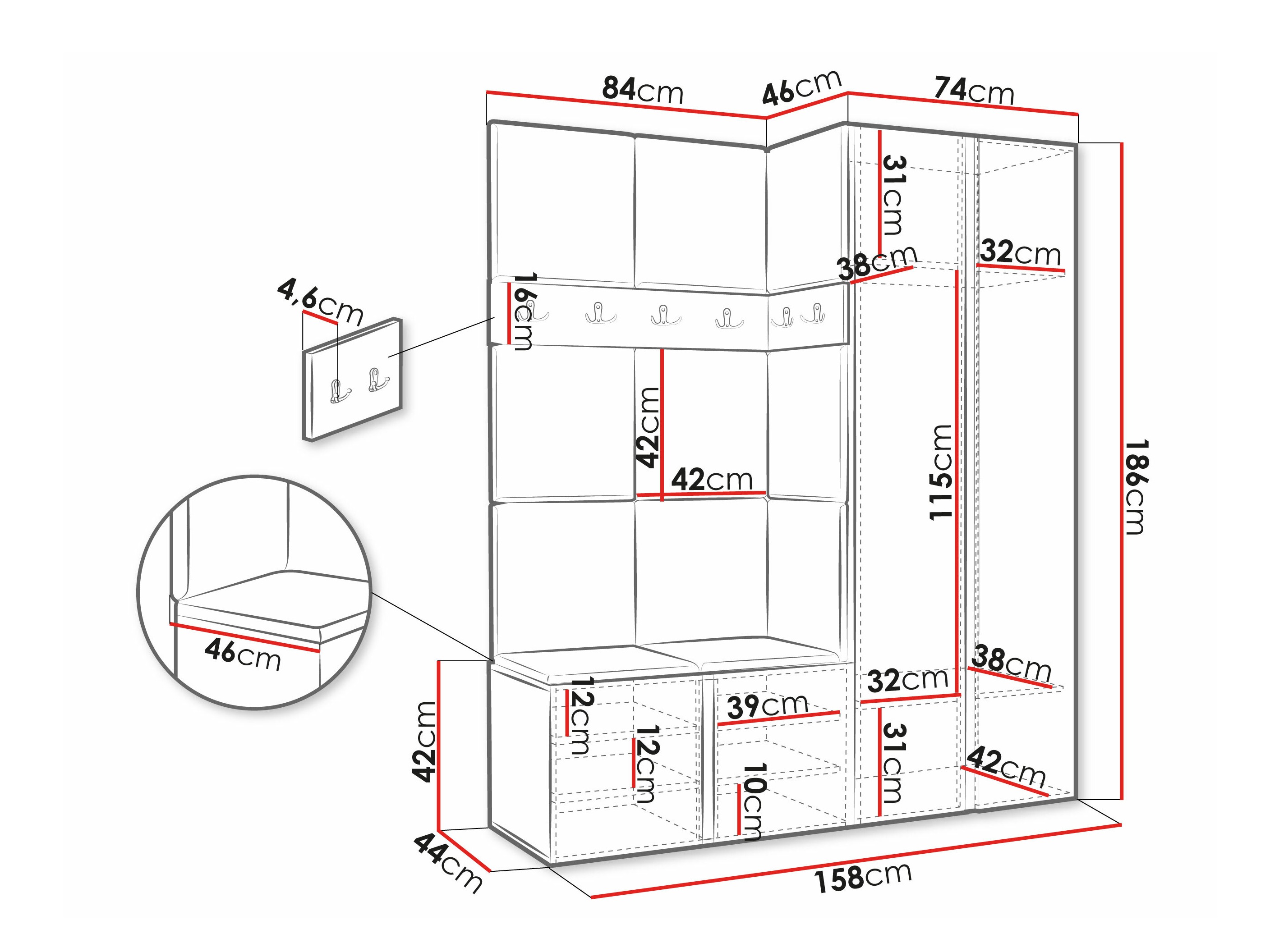 186 x 74 x 46 cm